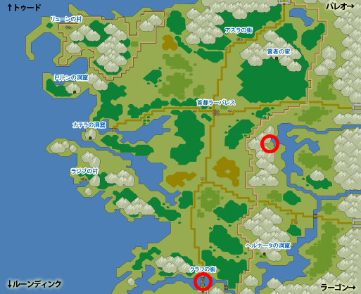 主にワールドマップ上で拾えます。街の中で人から入手するものもあります。以下マップを参照してください。
